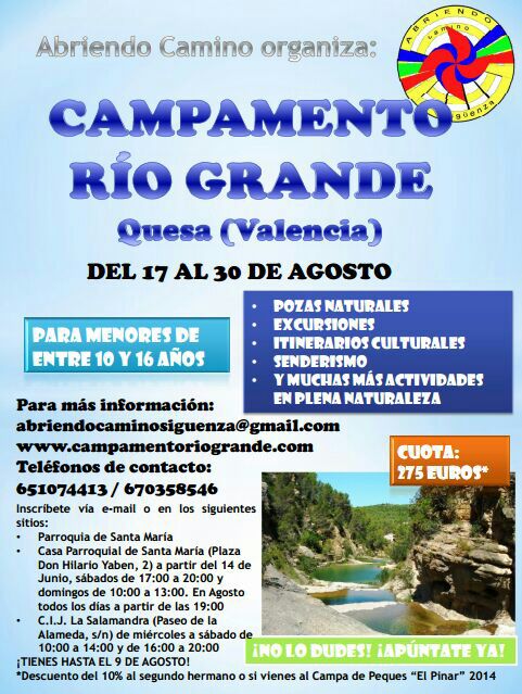 Ya puedes inscribirte en el campamento de “Rio grande” que será del 19 de agosto al 1 de septiembre en Quesa (Valencia). Tiene que rellenar la inscripción y enviarla al email abriendocaminosiguenza@gmail.com junto con la confirmación de pago o justificante de transferencia.